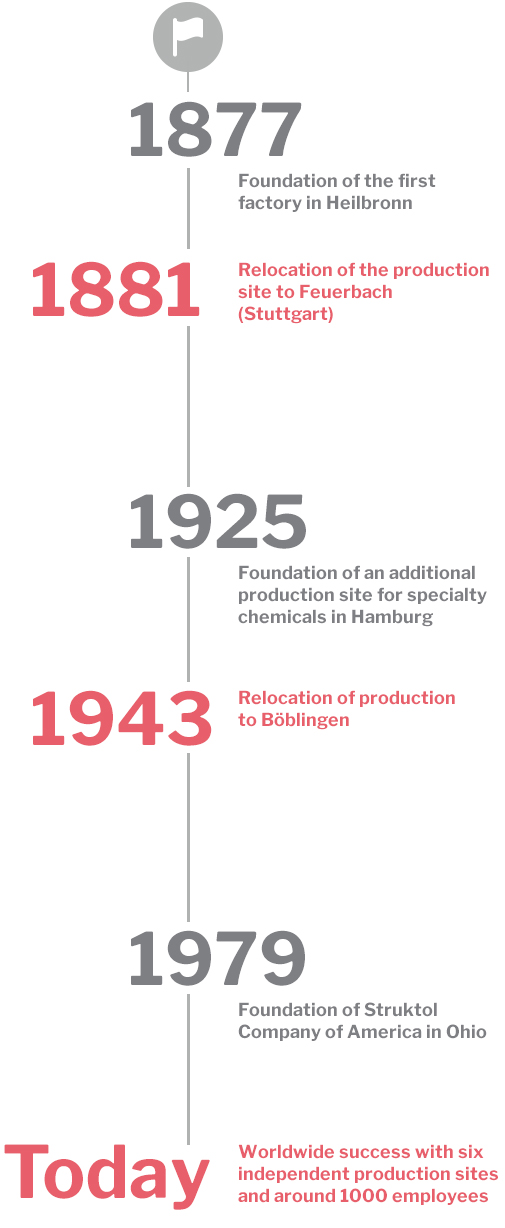 In Hamburg speciality chemicals for the rubber industry are developed and produced, such as defoamers, polymer dispersions silicone emulsions and latex supply products. The site in Böblingen manufactures speciality chemicals for the production and processing of chemical fibers, textiles, leather and paper as well as additives for cosmetics. The growing success of the products on the US market led in 1979 to the foundation of the Struktol Company of America located in Ohio. Two pure production sites, one in Pirna, Germany, and one in Villa Rica, Georgia, complete the company's product portfolio.